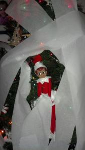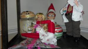 Jingle may be an Elf on the Shelf but he’s also got needs. While Jingle’s gender has always been somewhat open to debate (Nicole swears he’s a she and I swear he’s a he), he/she obviously has a thing for blondes. In this particular case, I caught him red-handed sharing a private moment with one of Cara’s Barbies. Notice also the pharmacy-costumed Santa behind him. Apparently he’s also got a thing for voyeurism. I warned him against starting a relationship, however brief with someone that’s been around the block as much as Barbie has but he didn’t listen to me. After a night of debauchery I found him, the following day, here: